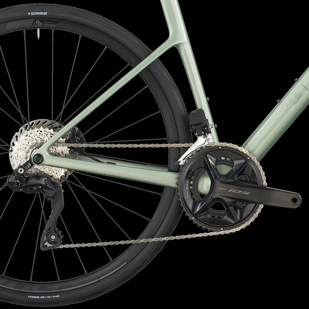 The Addict 40 is equipped for diverse riding scenarios. It boasts Shimano's 105 Di2 electronic 2x drivetrain, offering reliable and high-performance shifting without breaking the bank. Complementing this are durable Syncros RP2.0 wheels paired with Schwalbe ONE tires, ensuring a quick, confident, and smooth roll wherever your journey takes you.