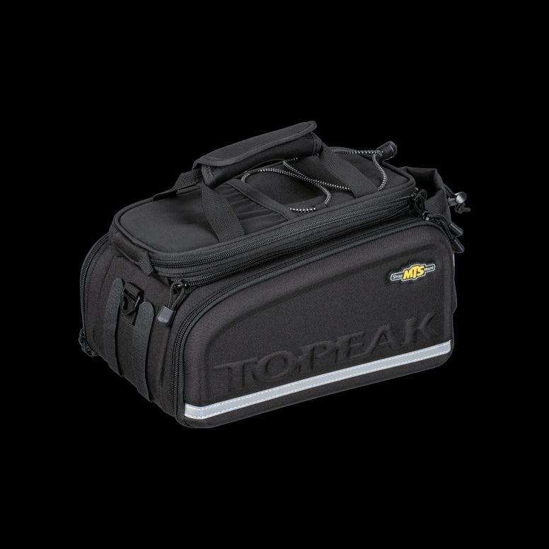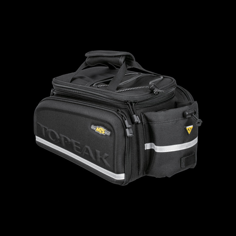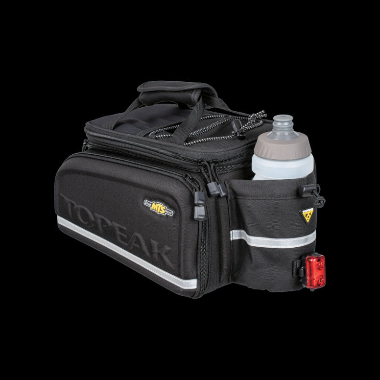 Dual molded side panels combine with flexible 600 denier fabric to form a semi-rigid, weather resistant trunkbag. Divided main compartment and side panels expand for extra storage capacity. Rear water bottle holder lets you carry more water on extended trips. Attaches to a rack with straps.